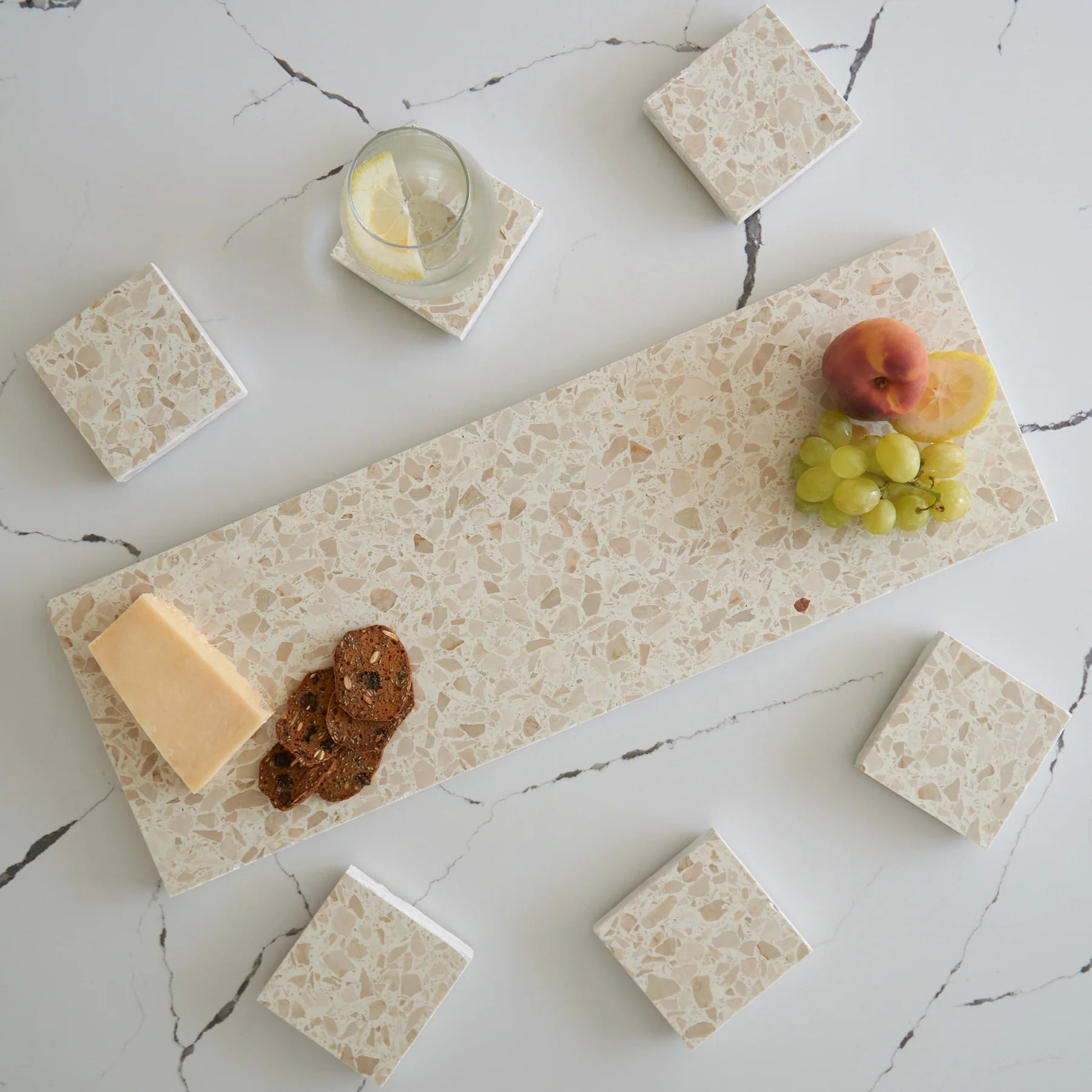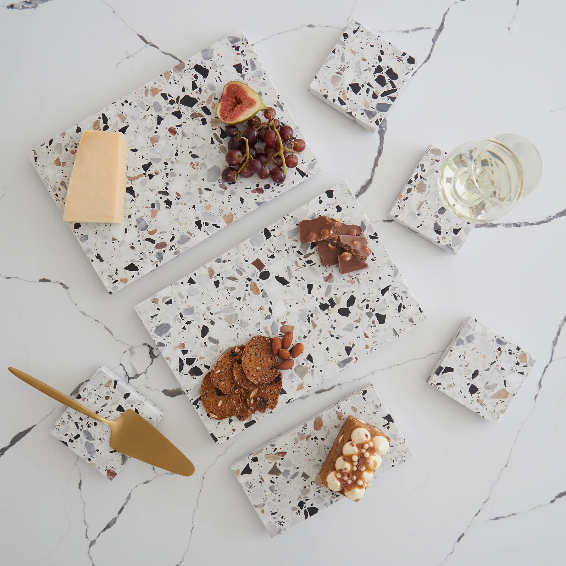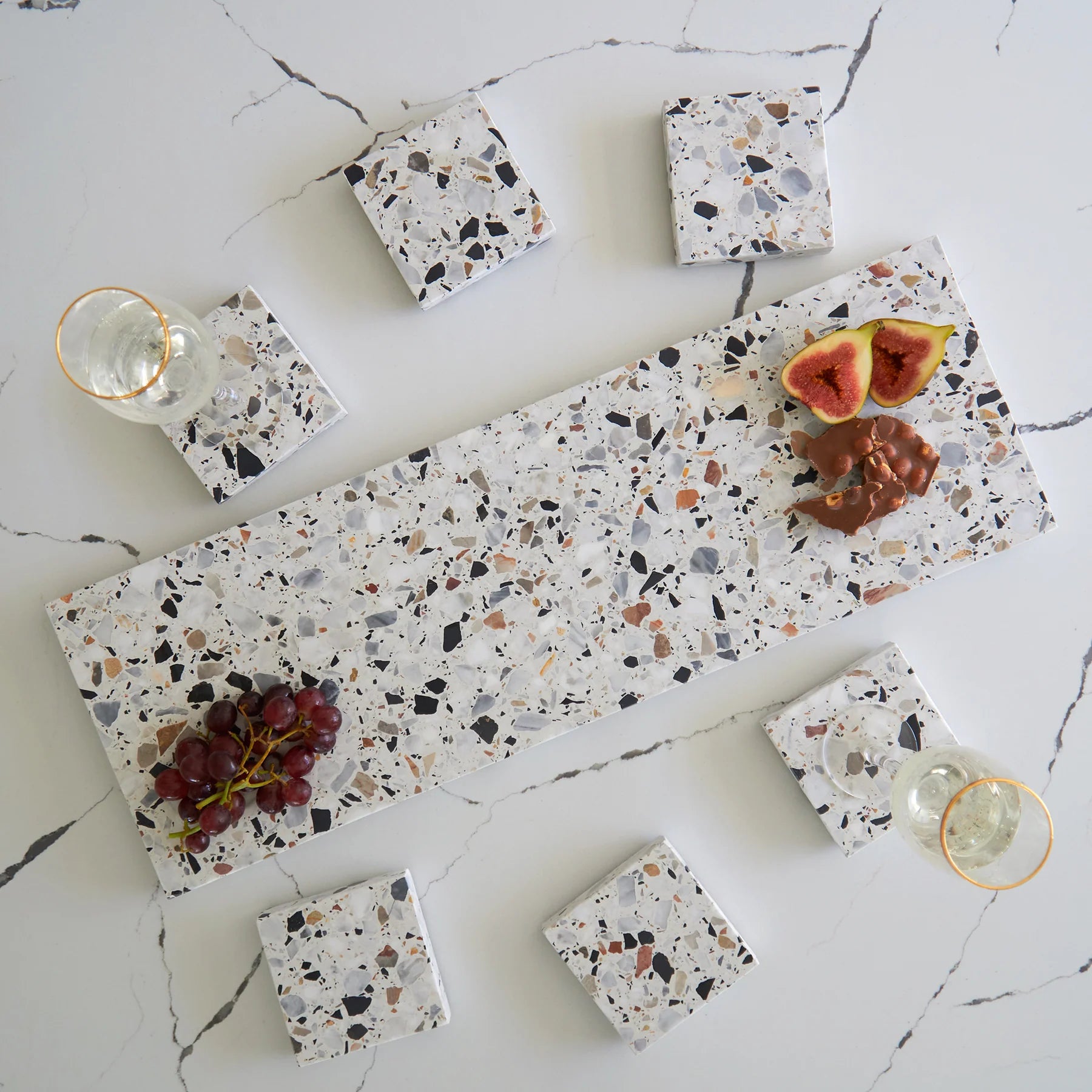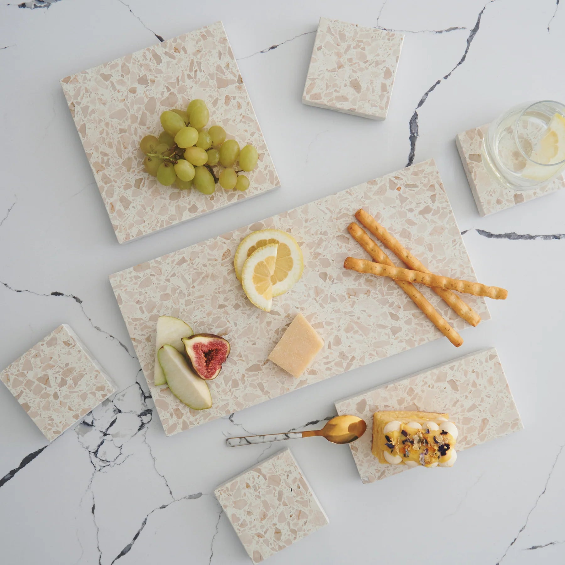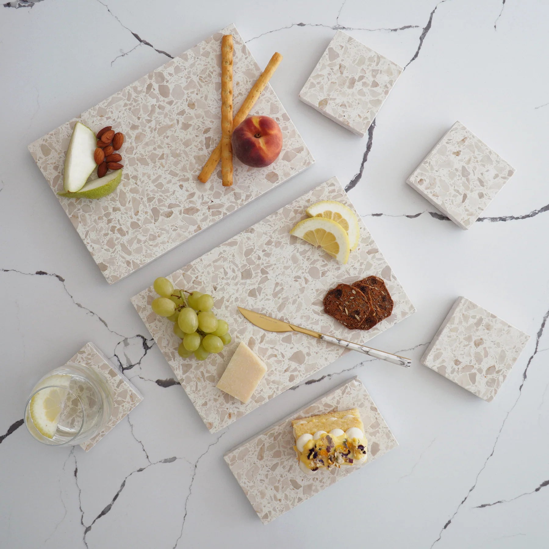 Stack Marble and Terrazzo pieces for an organic effortless look. Use these to create interest within your setting by layering textures and sizes.
