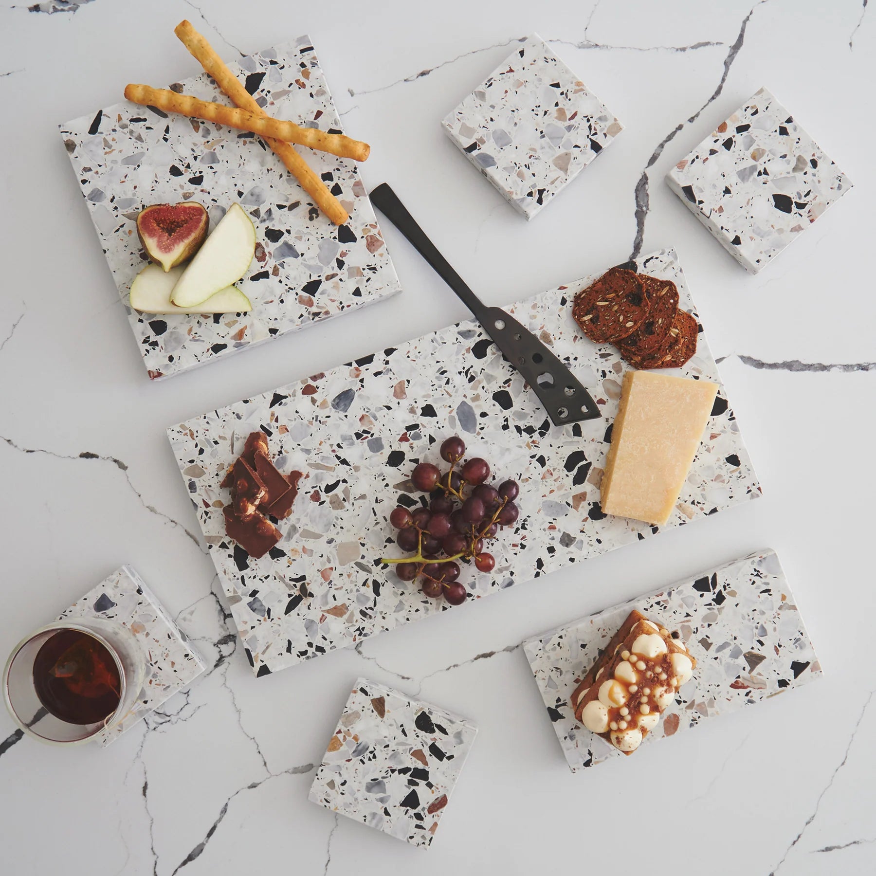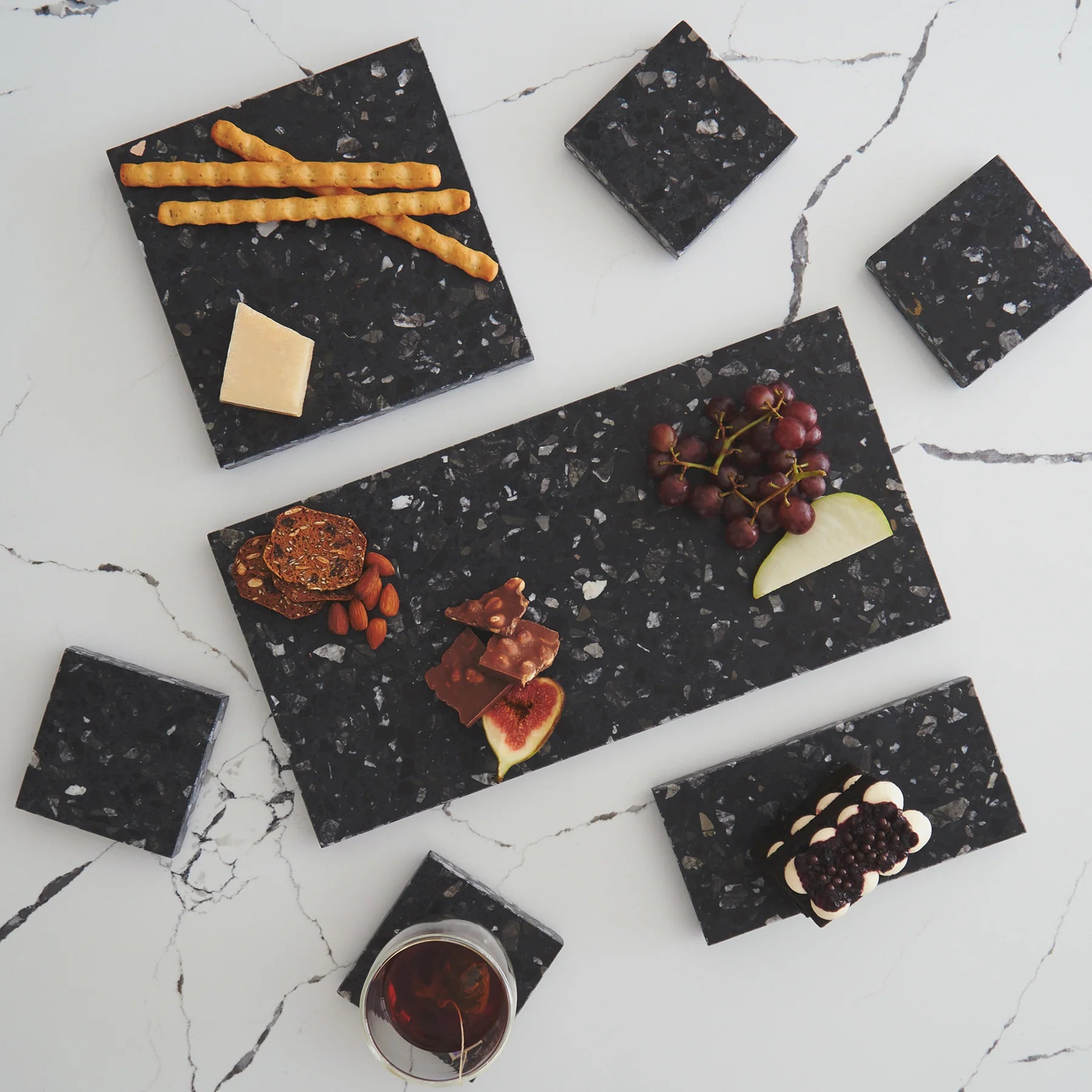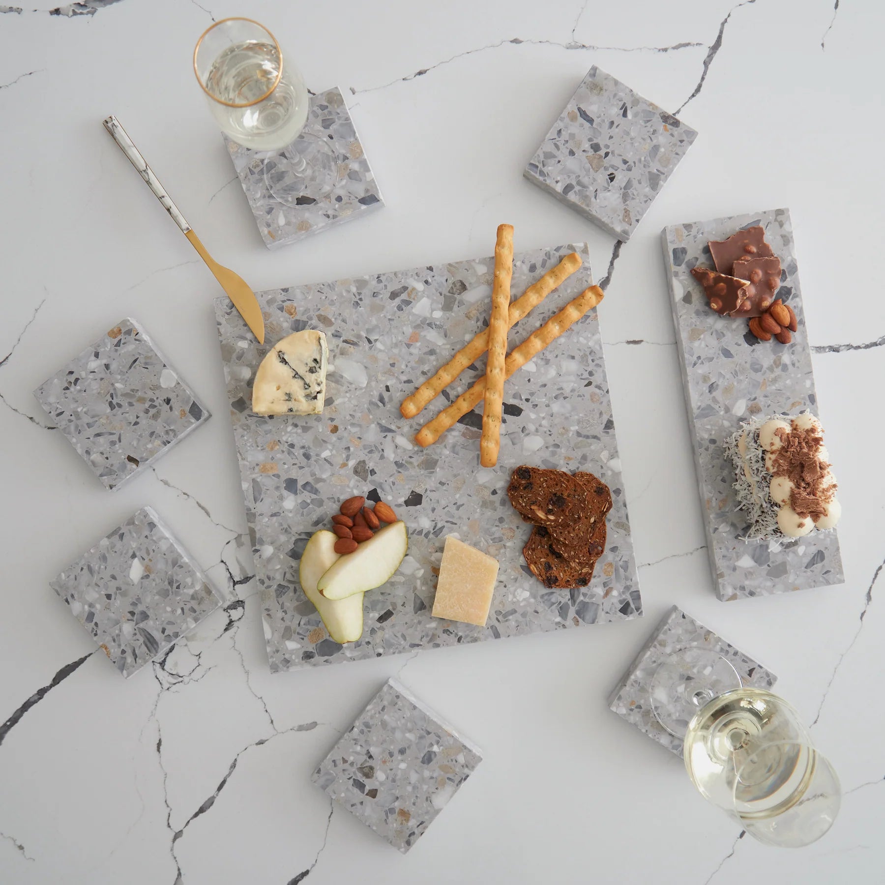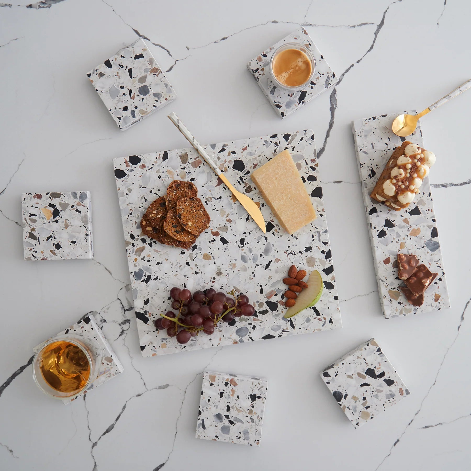 Stack Marble and Terrazzo pieces for an organic effortless look. Use these to create interest within your setting by layering textures and sizes.