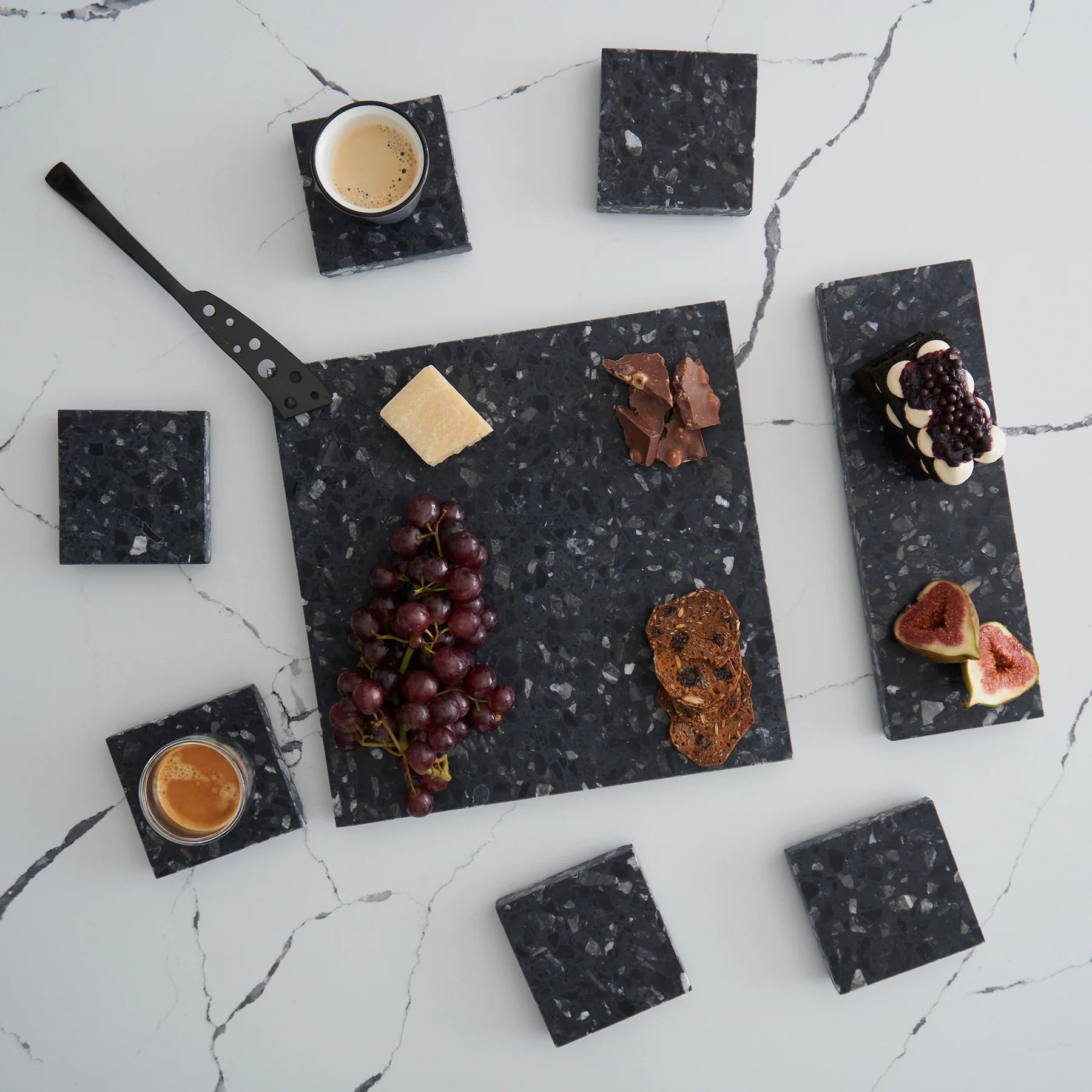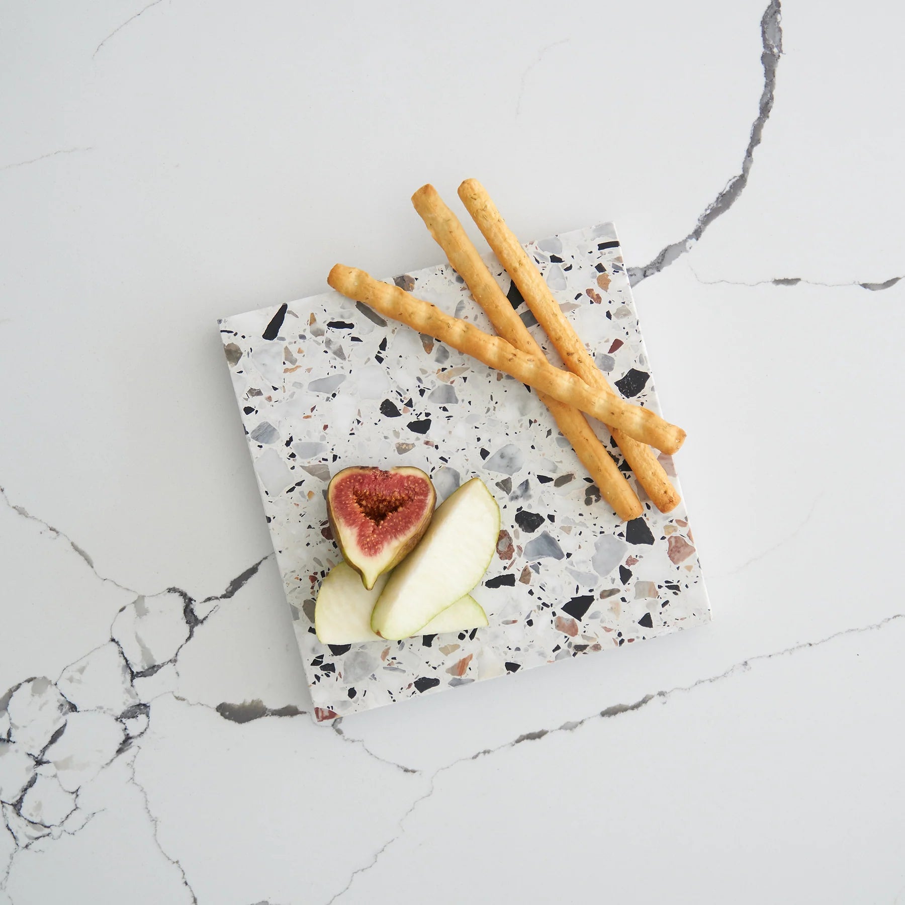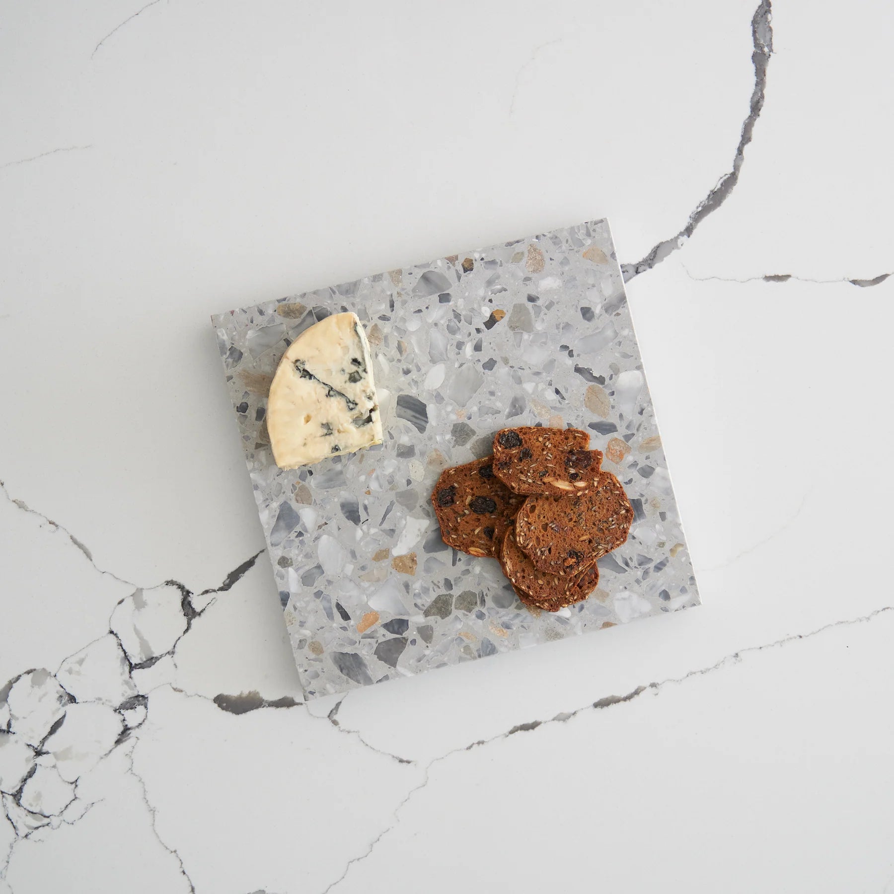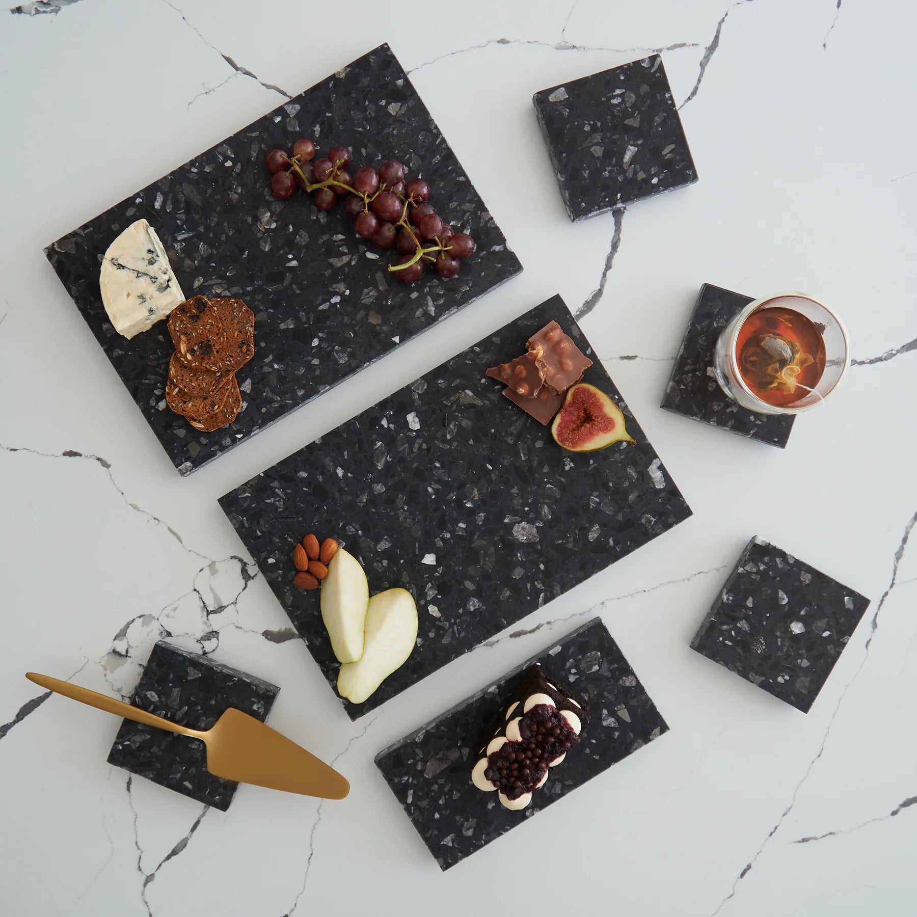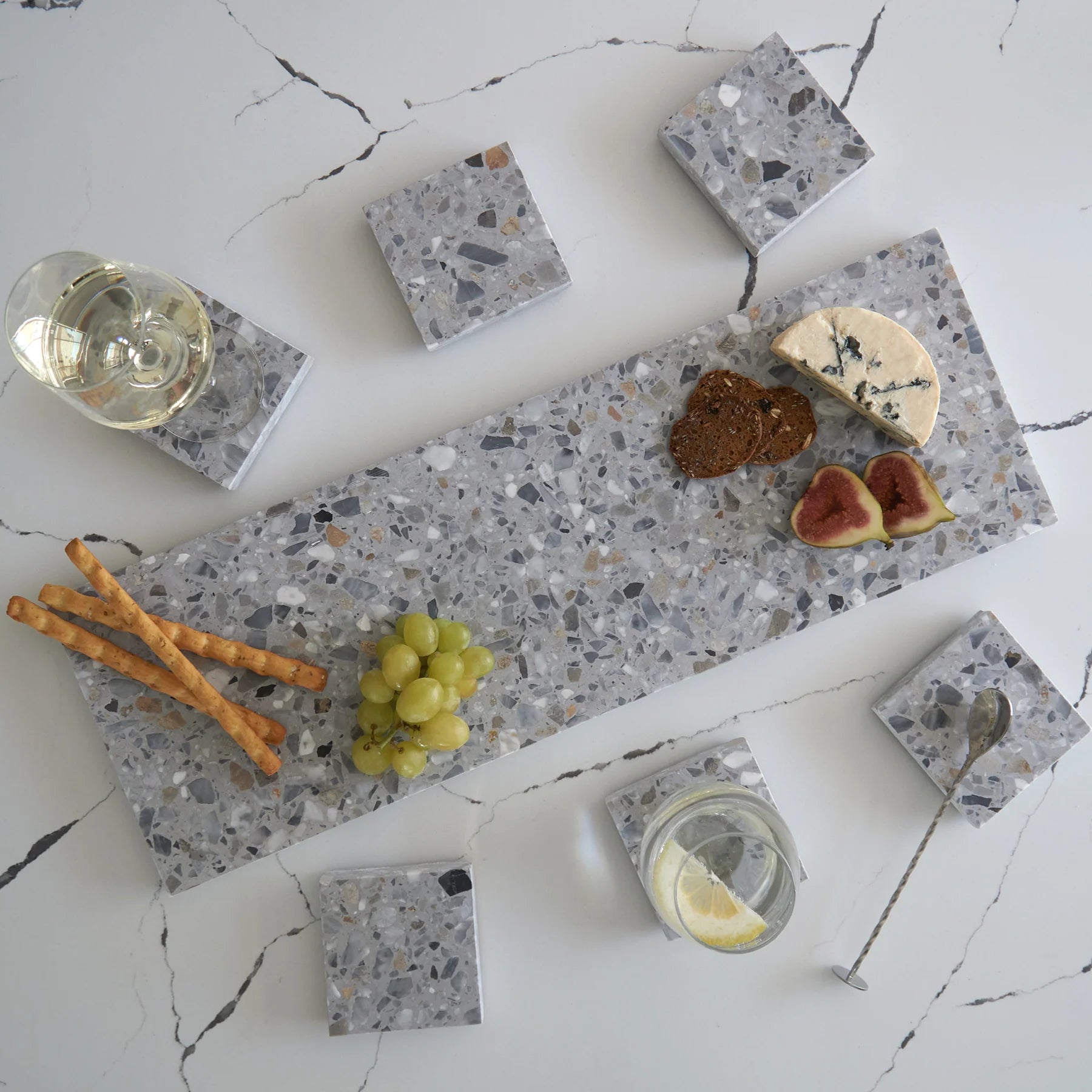 Stack Marble and Terrazzo pieces for an organic effortless look. Use these to create interest within your setting by layering textures and sizes.